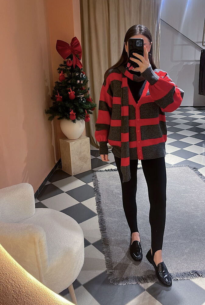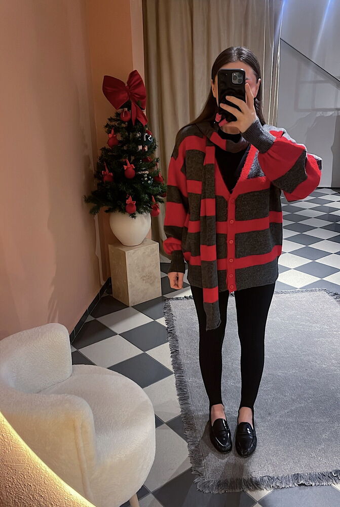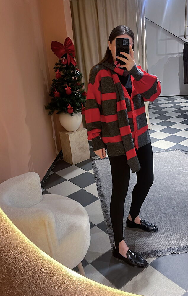 gri ve kırmızı çizgili atkılı bol kesim hırka