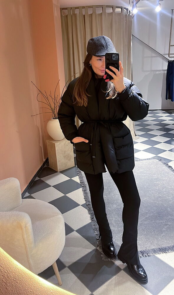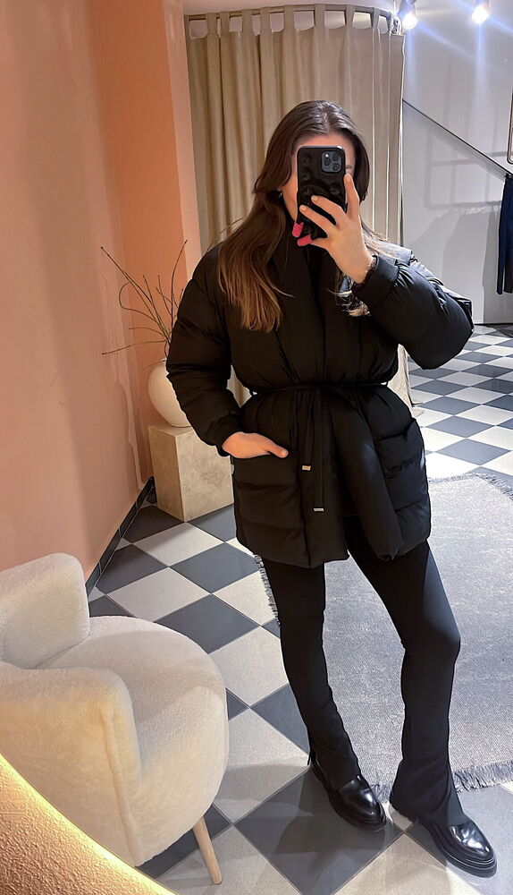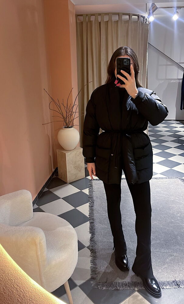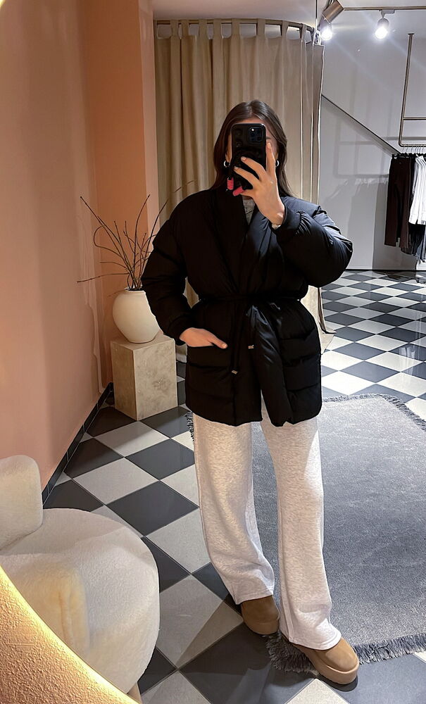 beli kuşak bağlamalı tam kalıp siyah renk şişme mont