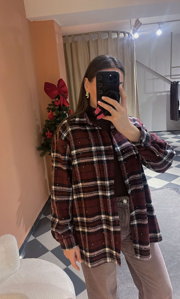 Boncuk zımbalı bordo siyah ekoseli standart beden bol kalıp gömlek
