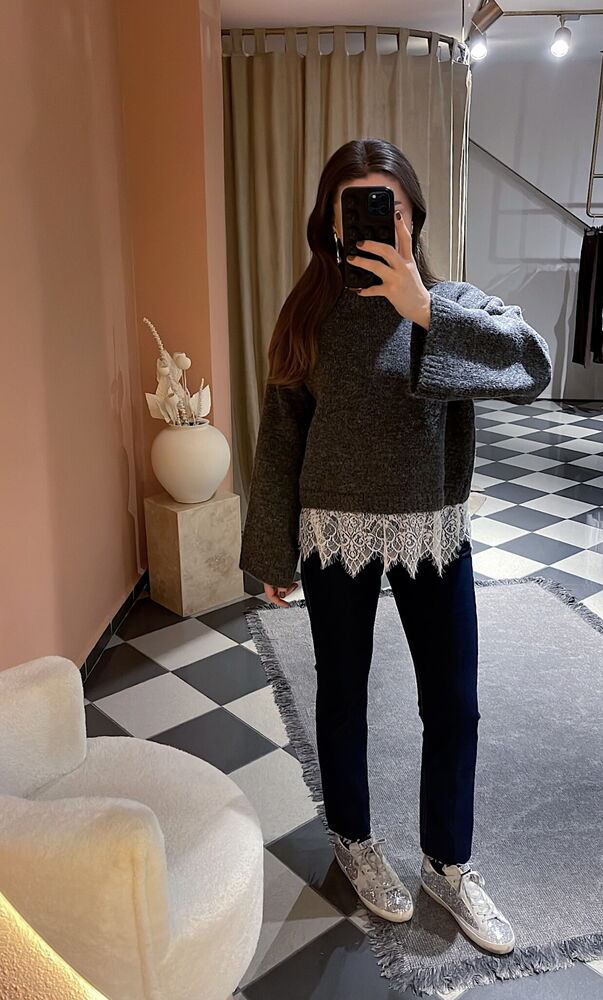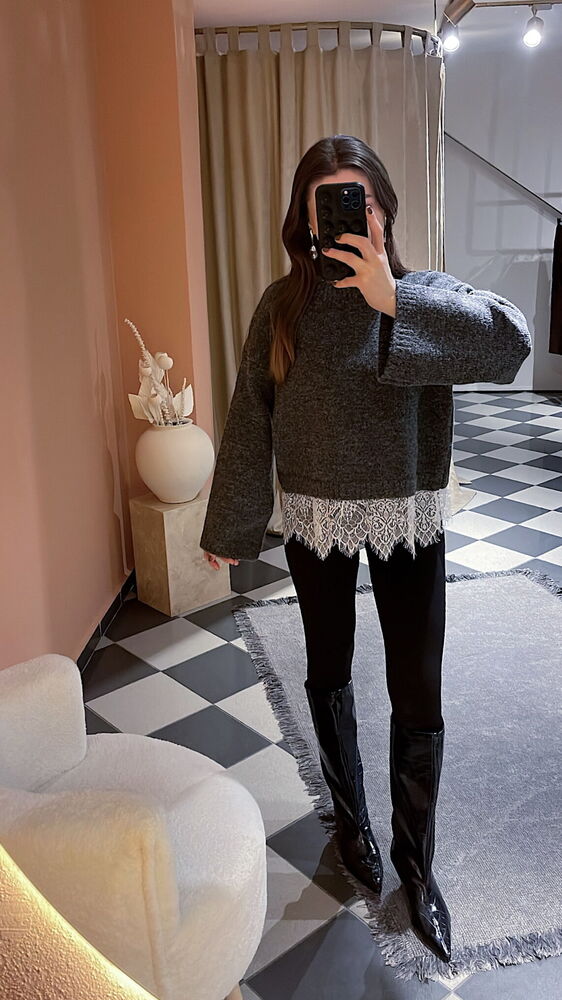 etek ucu dantel detaylı örme standart beden bol kalıp kazak