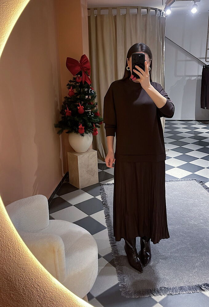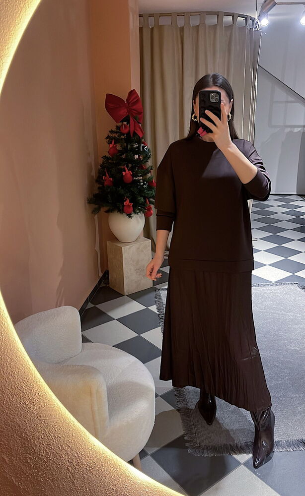 kahverengi etekleri pileli saten maksi boy bol kalıp elbise